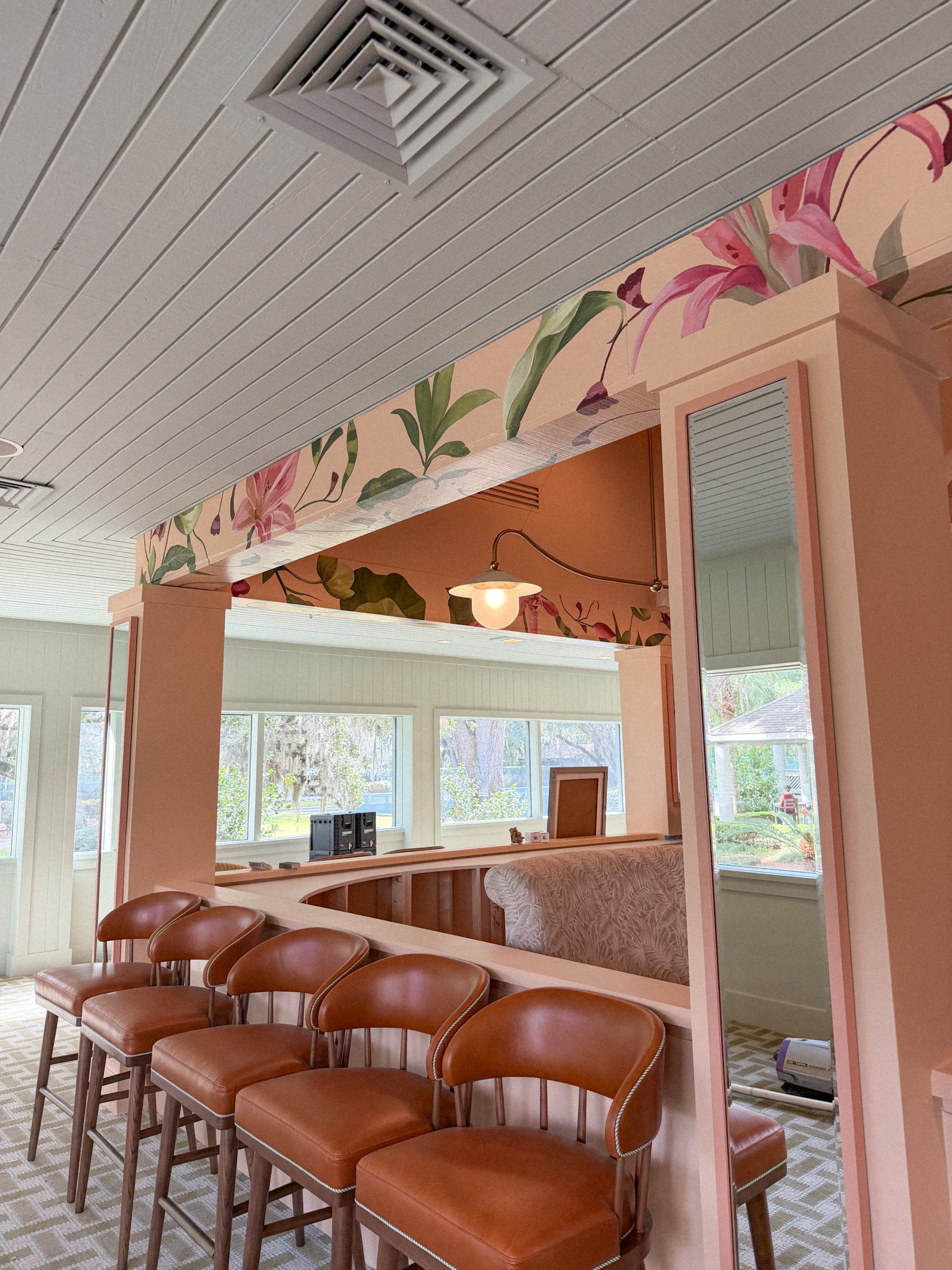 Painted within the newly renovated Nonna Mia at Omni Amelia Island, stylized florals wrap the restaurant, creating a botanical